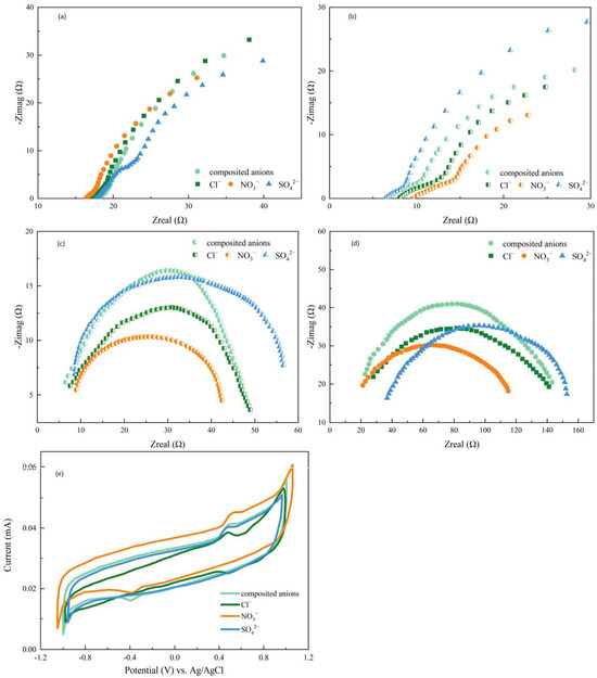 Nyquist plots used to determine the ohmic resistance: (a) anode + AEM at the beginning of each anionic MDC, (b) anode + AEM at the end of each anionic MDC, (c) whole system at the beginning of each anionic MDC, and (d) whole system at the end of each anionic MDC. (e) Cyclic voltammetry curves of anionic MDCs.