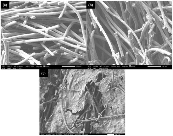 Changes in the graphite felt anode surface in the composited cation MDC during a cycle: (a) unused graphite felt; (b) after 10 h of operation; (c) at the end of the cycle.
