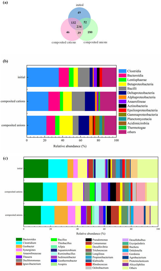 High-throughput sequencing of the 16S rRNA gene was employed to analyze the abundance and diversity of the microbial community in the anodes of different MDCs. As shown in Figure 5a, the operational taxonomic units (OTUs) of the bacterial sequences in the composite anion MDC (505) were greater than those in the initial inoculated sludge (467) and cation MDC (415). Correspondingly, the total numbers estimated by the Chao1 estimator were 477.2, 193.6 and 525.5. Larger OTUs and Chao1 values indicated more species in the anode of the composited anion MDC. In addition, the highest Shannon index of the composited anionic MDC (2.71) reflected the highest microbial diversity and evenness [30]. A Venn diagram (Figure 6) intuitively revealed the similarities and differences among the three samples. The number of overlapping OTUs of the initial inoculated sludge and composite cation MDCs reached 366, whereas the numbers of unique OTUs were only 49 and 46, respectively. This result indicated that the microbial compositions of the initial inoculated sludge and the composite cation MDC were highly similar. However, few OTUs associated with the composite anion MDC overlapped with the others, and 180 unique OTUs were identified. Apparently, the microbial community structure of the anodes was greatly altered by the addition of different anions.