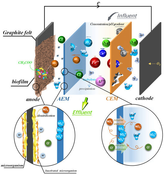 With the gradual increase in the population, the consumption of water resources is increasing day by day, and wastewater recycling has become the major solution to sort out this problem [1]. Since industrial wastewater emissions account for a large portion of water consumption, reusing industrial wastewater can reduce the amount of wastewater discharge and effectively solve the problem of water shortages [2]. Currently, the low-value reuse of industrial wastewater (e.g., recycled irrigation water or road-washing water) accounts for a large percentage of reuse [3]. However, since industrial wastewater contains high levels of calcium and magnesium ions, some degree of deionization tertiary treatment is needed to mitigate the effects of scaling and corrosion before reuse [4]. Conventional desalination methods are separated mainly by thermal methods (MSF, MED) [5], membrane separation methods (Reverse Osmosis, Nanofiltration) [6,7] or electrical separation [8], all of which can be effective in desalination but are economically more costly; AMDC has also been proposed in related studies but is difficult to engineer on a large scale, owing to output efficiency limitations [9]. The CW-MFC system has made a significant contribution to engineering applications in this field, but further investigations of the microorganisms and the internal mechanisms of MDCs are still needed [10]. Thus, more preferable technologies are needed. Microbial desalination cells (MDCs) derived from microbial fuel cells (MFCs) are current promising methods for wastewater treatment and reuse because of their good deionization properties and low energy consumption [11]. First proposed by Cao in 2009, MDCs use the underlying charge produced by biodegradation processes to actuate ion transfer, even in the absence of applied energy to drive the reactor [11]. The basic three-chamber MDC contains an intermediate desalination chamber, which is separated from the anode by an anion exchange membrane (AEM), and the cathode is separated by a cation exchange membrane (CEM). Significant progress has been made in the MDC in terms of the design of the reactor and the size of the processing [12], which further increases the efficiency of desalination and MDC energy production. At present, however, there are few studies on the mechanism of the effect of MDC ion transfer on reactor systems, and it is difficult to develop MDCs. In a previous study [13], the effect of cation migration on the performance of MDC was investigated, and it was concluded that the removal rate of MDC in one cycle followed the sequence of Na+ > Ca2+ > Cu2+ > Al3+ > Fe3+. Other studies have shown that the migration of ions and the fouling of Ca2+ and Mg2+ on membranes affect the long-term operation of MDCs [14] and that a decrease in pH affects the activity of electro-producing microorganisms and influences electron transfer during microbial degradation in the anode chamber [15]. However, due to the diversity and complexity of ionic species in industrial wastewater, the anions and their interactions in MDCs related to industrial wastewater need to be further explored. Previous work has explored only the cations and their interaction mechanisms in MDCs; because of the induced pH change in the anode chamber and the change in ambient pH due to the solubility product of the cations themselves, only a small fraction of Fe3+ and Al3+ can undergo effective transmembrane transfer, and more Fe3+ and Al3+ will be hydrolyzed and precipitated directly in the desalination chamber [13]. In anionic MDCs, as anion movement significantly affects the pH of the anode chamber, it has a much more negative impact on the microbial environment, which in turn counteracts ion migration via a very different mechanism than that of cations. Understanding the interplay among anion ion migration, the environment and microbial action is therefore necessary to study the overall operational efficacy of MDCs. In this case, solving anion-related problems will help optimize MDC systems and promote the further diversification of MDCs.