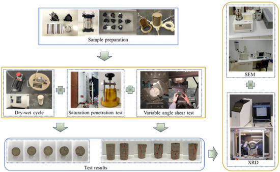 In the study of the physical and mechanical properties of rocks, cohesion and the internal friction angle are extremely important parameters for judging their mechanical properties. The testing equipment used is the WAW-1000 electro-hydraulic servo rock mechanics testing system (Jinan Zhongluchang Testing Machine Manufacturing Co., Ltd., Jinan, China). This test adopts the variable angle shear method to test the shear strength parameters of mud tuff specimens. Due to the influence of the wet expansion and dry contraction characteristics of mud tuff specimens in the process of dry and wet cycling, it is not possible to obtain a standard specimen, but only a cylindrical specimen with a diameter of 48 mm and a height of 97 mm. Therefore, when performing the variable angle shear test, it is necessary to pad a layer of steel plate with an inner diameter of 48 mm inside the variable angle plate fixture, the outer diameter of which coincides completely with the fixture, because the angle of the variable angle plate fixture can not be lower than 30°, nor can it be higher than 70°. Shear angles of 40°, 50°, and 60° are selected for two sets of parallel tests during each wet–dry cycle, with continuous loading at a speed of 0.2 mm/s until the system automatically stops. The final results are averaged from three sets of parallel tests.