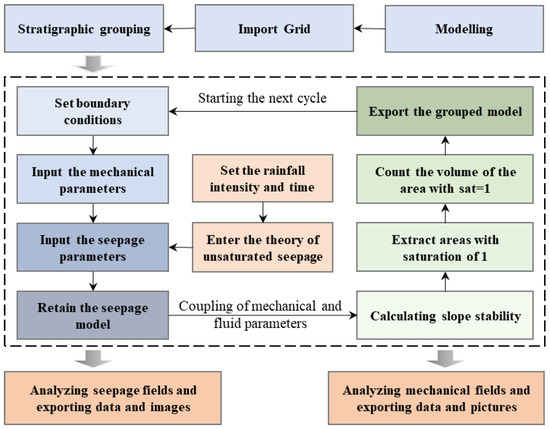 Currently, there are various numerical simulation software available for calculating slope stability. FLAC3D 6.0 software, using finite difference methods, has unique advantages in solving problems such as large deformations and discontinuous deformations. From the above presentation of unsaturated soil theory, the command flow chart for the wet–dry cycle scheme in this numerical simulation is shown in Figure 3 below.