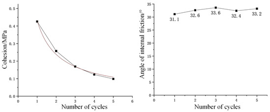 It can be seen that the cohesion shows a gradual downward trend under wet–dry cycles, while the internal friction angle remains around 32°, essentially unaffected by the wet–dry cycles. This is mainly due to two reasons: First, the dissolution of soluble minerals and matrix with wet–dry cycles leads to the softening of mudstone limestone; second, frequent wet–dry cycles cause the mineral particles to wear into a uniform and regular spherical shape, reducing the friction between particles during loading. The combined effect of these two factors ultimately manifests as a decrease in cohesion.