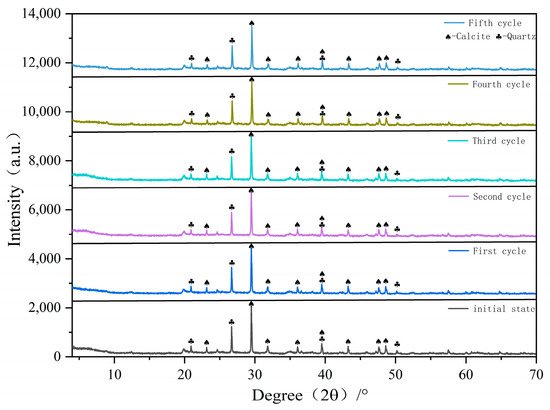 It can be observed that the primary mineral constituents of mudstone limestone are quartz and calcite. The diffraction patterns obtained from the X-ray diffraction analysis show no new peaks, indicating that no new substances are generated during the wet–dry cycles, thus confirming that no chemical reactions occur during these cycles. According to the data, the proportion of quartz mineral content decreases overall while the proportion of calcite mineral content increases. Since the mineral content of rocks significantly influences their mechanical properties, it can be inferred that the reduction in quartz content is one of the reasons for the decreased strength of the mudstone limestone samples, with quartz making a substantial contribution to the strength of mudstone limestone.