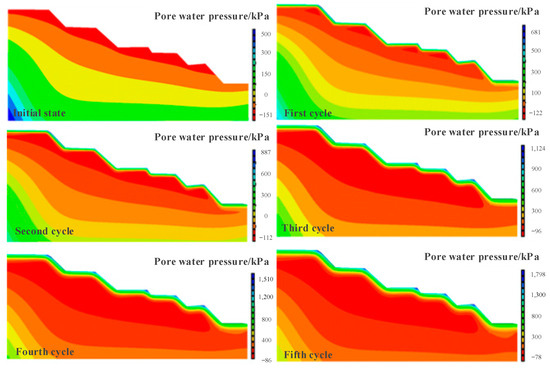 Since the first change caused by rainfall is in the seepage field within the slope body, and only then is the changed flow field coupled into the mechanical field, these are two distinctly separate aspects. Here, we first analyze the flow field of the slope. By studying the seepage field within the slope, we understand the distribution of water pressure within the slope body and conduct qualitative and quantitative analyses of the flow field during rainfall. The main focus is on the depth of the wetting front and the changes in its depth before and after seepage filtration. The changes in the seepage field within the slope body after rainfall under different cycles are shown in the Figure 8 below.