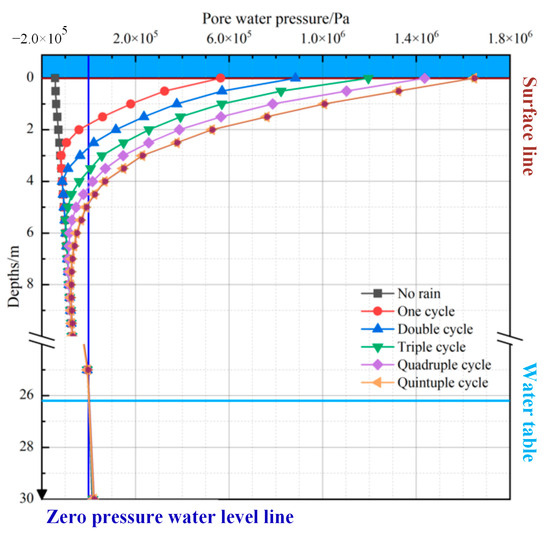 Furthermore, the groundwater level in this area is basically unaffected by the rainfall cycle and remains stable at about 26.2 m underground. The intersection of the pore water pressure–depth curve and the groundwater level curve shows that after each rainfall, the range of the rainwater influence zone is larger than that of the transient saturated zone and expands with the increase in the number of cycles. After five cycles, the influence is deepest at 9.5 m, and the negative pore water pressure in the influence zone decreases, with the matrix suction dropping from 122 KPa to 78 KPa.