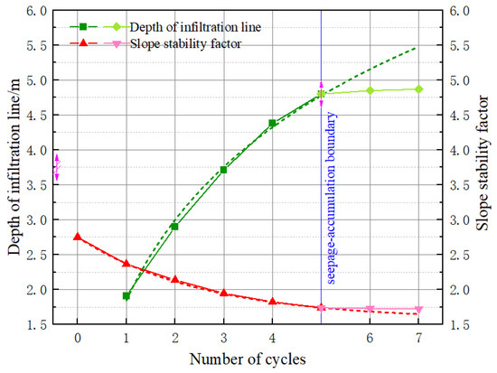 As the number of wet–dry cycles increases, the stability of the slope is observed to decrease. This decrease is not linear; rather, the rate of decrease gradually slows down as more cycles are completed. This pattern suggests that while the initial cycles have a more pronounced impact on slope stability, subsequent cycles have a diminishing effect. The depth of the wetting front, which is the boundary between the saturated and unsaturated zones within the slope, plays a crucial role in this process. There is a clear negative correlation between the depth of the wetting front and the stability of the slope. With each rainfall cycle, several changes occur within the slope that contributes to its decreasing stability. The range of the transient saturated zone expands, and both the positive and negative pore water pressures increase. These changes are significant because they affect the internal forces within the slope. As the wetting front moves deeper into the slope, it indicates that more water is infiltrating and saturating the soil or rock. This infiltration leads to an increase in pore water pressure, which in turn reduces the effective stress and the shear strength of the slope materials. Consequently, the slope’s ability to resist failure is compromised, and its stability coefficient decreases.