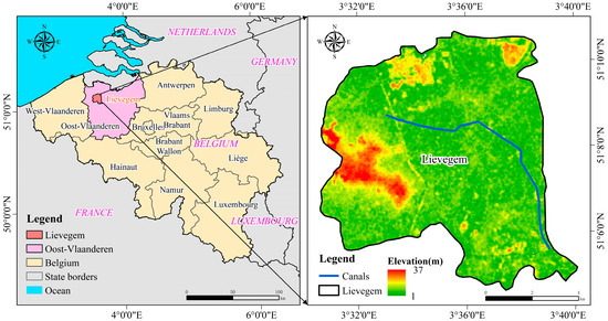 Study area. The blue line marks the Lieve River within Lievegem, where the sampling was conducted. Elevation data is sourced from NASA’s 30 m Digital Elevation Model (DEM) [32].