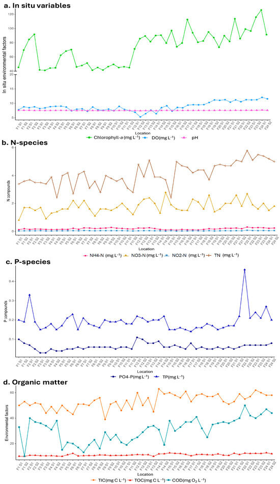 The spatial variability of water quality parameters along the Lieve River was analyzed, focusing on environmental factors represented as in situ variables (Chlorophyll-a, DO, pH, EC), nitrogen species (TN, NO3-N, NO2-N, NH4-N), phosphorus species (PO4-N, TP), and organic matter (TIC, TOC, COD). Figure 2. illustrates the spatial distribution of these parameters, highlighting significant variations across monitoring locations. Other detailed values for those parameters are provided in Supplementary Materials Tables S1–S3.