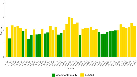 The water quality of the Lieve River, assessed using the Prati index, displayed spatial and categorical variability across the 48 sampling points, as shown in Figure 3. Results indicated that 41.7% (20 locations) of the sampling locations were categorized as “Acceptable quality” (Prati index ≤ 2.0), while 58.3% (28 locations) were classified as “Polluted” (Prati index > 2.0). The distribution of water quality classifications reveals a trend, with cleaner sites predominantly located near the F1 direction and more polluted sites concentrated closer to the F24 direction. This spatial variability highlights potential cumulative anthropogenic impacts, such as urban runoff, agricultural discharge, and point-source pollution, contributing to water quality degradation. A detailed summary of Prati index results is provided in Supplementary Materials Table S4.