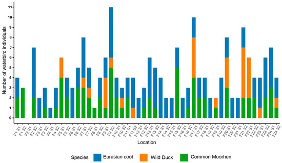 The common moorhen displayed a variable distribution, with a total of 71 individuals recorded. Moorhens reached their peak abundances at F9 S2 and F15 S2, where 5 individuals were observed. These locations may offer shallow water habitats characterized by emergent vegetation, which are commonly associated with moorhen foraging and nesting preferences, as suggested by previous studies [59,62]. Regions like F9 S2 exhibited moderate DO levels and elevated TOC concentrations, conditions that may indicate moorhens’ tolerance to localized organic matter accumulation. However, conclusions on their adaptability require further analysis across multiple sites.