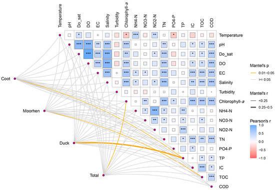 Relationships between water quality parameters and waterbird abundance along the Lieve River. The figure combines Pearson correlation coefficients and Mantel test results to highlight associations between water quality parameters and waterbird species abundance. Positive correlations are shown in blue, while negative correlations are in red. The line thickness represents Mantel’s r values, with thicker lines indicating stronger correlations. Mantel’s r: A measure of the strength of correlation between two distance matrices, reflecting how closely the spatial variation of water quality matches bird abundance. Mantel’s p: The statistical significance of the Mantel test, with lines in orange representing significant relationships (p = 0.01–0.05) and lines in gray indicating non-significant relationships (p ≥ 0.05). (*) indicate the significance level of Pearson’s correlation coefficients: p < 0.05 (*), p < 0.01 (**), and p < 0.001 (***).