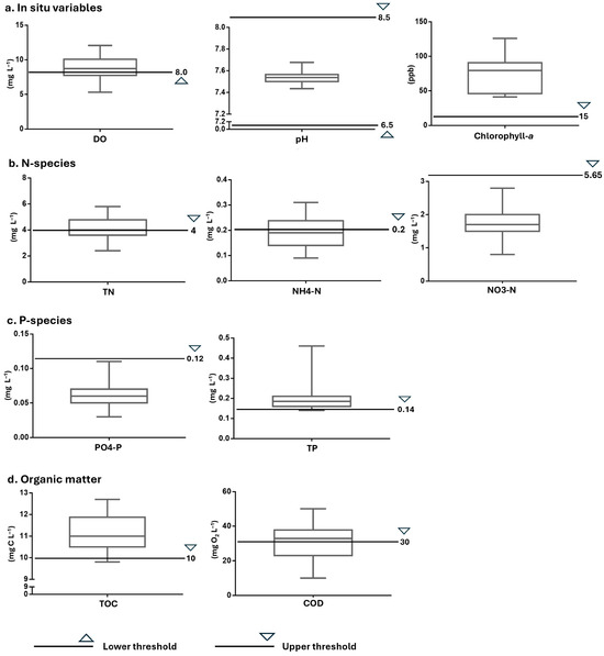 - Kim, H.G.; Hong, S.; Chon, T.-S.; Joo, G.-J. Spatial Patterning of Chlorophyll a and Water-Quality Measurements for Determining Environmental Thresholds for Local Eutrophication in the Nakdong River Basin. Environ. Pollut. 2021, 268, 115701. [Google Scholar] [CrossRef]