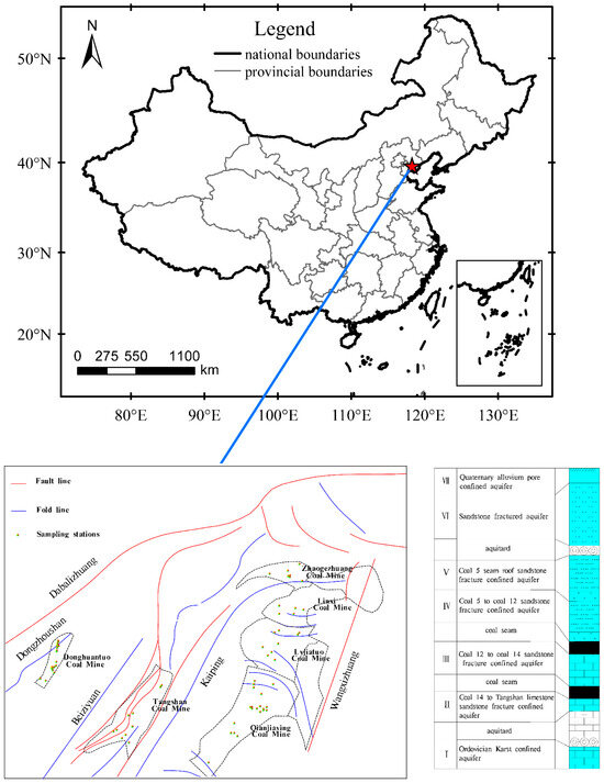 Multiple groundwater aquifers are present within the Kailuan mining field (Figure 1). Aquifers I, VI, and VII serve as indirect mine-filling aquifers, while aquifers II, III, IV, and V function as direct mine-filling aquifers.