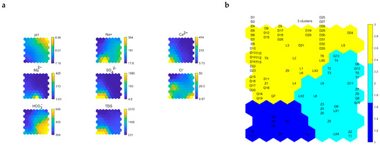 SOM clustering results. (a) SOM visualization of hydrochemistry and water quality assessment, where numbers indicate values of corresponding variables; (b) SOM clustering results, where D1 and other similar letters represent the sample number.