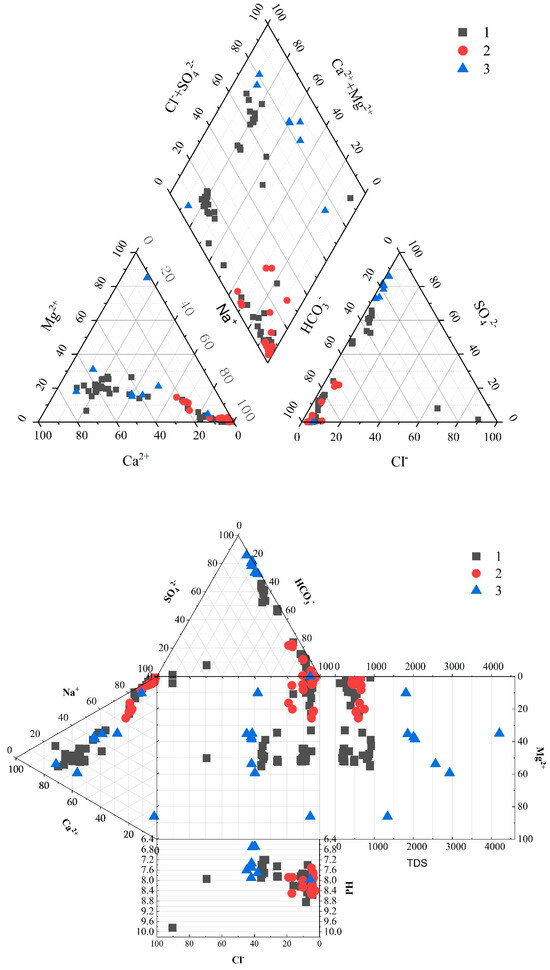 (2) PCA combined with personal correlation analysis obtained three principal components: PC1 explained 46.4% of the total variance, with a higher correlation with TDS, Ca2+, and SO42−, which may represent water–rock interaction (dissolution/precipitation of sulfate) and natural evolution of groundwater (evaporation concentration); PC2 explained 46.4% of the total variance, with a higher correlation with Na+ and HCO3−, which may be related to the dissolution of salt rock, evaporation concentration of groundwater; PC2 explains 23.4% of the total variance and correlates with Na+ and HCO3−, which may be related to the dissolution of salt rock and evaporation concentration; PC3 explains 10.6% of the total variance and correlates significantly with Mg2+ and Cl−, indicating the ion exchange between sulfate minerals and the ion exchange effect of carbonate minerals.