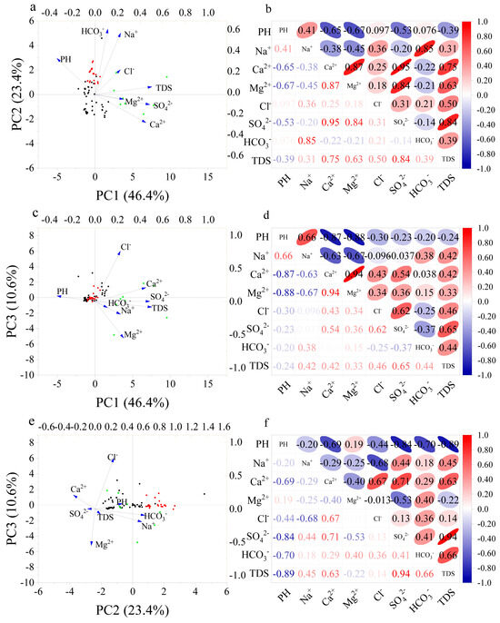 Possible sources of dissolved solutes in the Kailuan mining area by principal component analysis (PCA) (a,c,e) and correlation coefficient matrix analysis among different parameters (b,d,f).