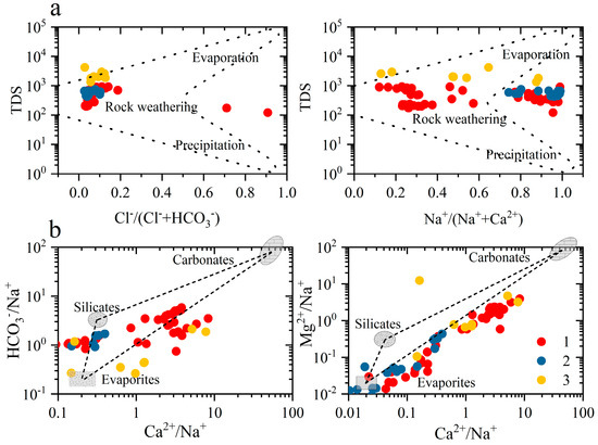 During the chemical evolution of groundwater, different ions show different contributions and different ion ratios have different meanings [26,27]. In order to explore the main types and chemical compositions of weathered rocks, three groups of water samples were analyzed by ion ratio analysis [28,29,30].