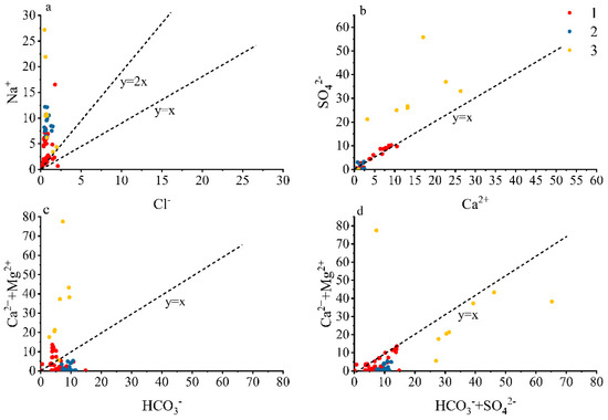 In Figure 7d, the sample points of both group 1 and group 3 are distributed below the 1:1 relationship line, and nearly all water samples have less Ca2+ + Mg2+ than HCO3− + SO42−, indicating that Ca2+ and Mg2+ mainly originate from the weathering of silicate and sulfate, and most water samples of group 1 are distributed near the 1:1 line, indicating that Ca2+, Mg2+ mainly originate from the dissolution of carbonate and gypsum.
