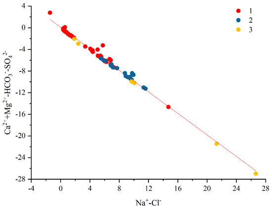 Relationship between (Ca2+ + Mg2+-HCO3−-SO42−) and (Na+-Cl−).