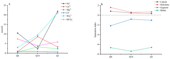 (a) The change diagram of main ion content is in path 1 and path 2. (b) Saturation index values of calcite, dolomite, gypsum, and halite in mine water in path 1 and path 2.