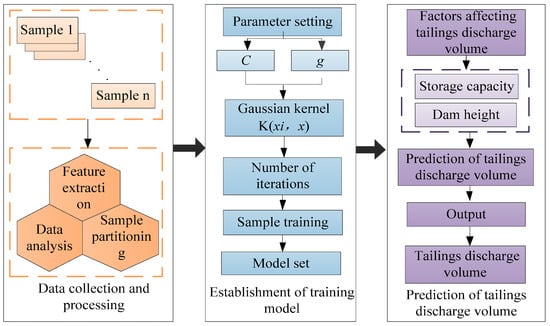 Based on the principles of the SVM outlined above, the nonlinear training process for predicting tailings discharge volume and influence distance after tailings dam failure is illustrated in Figure 1.