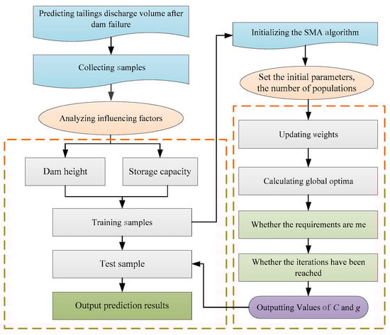 The dam height and tailings storage capacity were used as sample inputs xi, while the predicted target tailings discharge volume was used as model outputs f(xi), based on the principles of the SVM algorithm and the key factors influencing dam failure. As detailed in Table 1, relevant information from 65 dam-failure cases summarized by Rico et al. was collected to construct a sample dataset [43,44,45], including 56 training samples and 9 testing samples. During the optimization process of the SMA–SVM algorithm, the sma SVMcg ForRegress program was first used to train the samples and identify the optimal SVM parameters. After SMA optimization, the best penalty parameter C and the best width of the kernel function g were determined and then entered into the test set for the prediction.