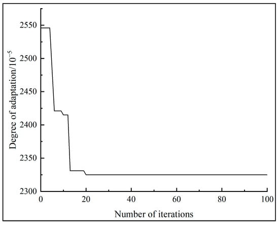 When constructing the sample dataset based on Table 1, the value range of the storage capacity in the sample dataset is [2.7, 7400], which differs significantly from those of other parameters. Therefore, normalization was applied to the storage capacity and tailings discharge volume to ensure prediction accuracy. A total of 85% of the samples were used as training samples, while the remaining samples were used as testing samples for prediction. The predictions for the test samples were performed using Random Forest (RF), Radial Basis Function (RBF), Least Squares Support Vector Machine (LS-SVM), and SMA-SVM algorithms. The optimized values of C and g from the SMA-SVM algorithm are listed in Table 2, the fitness curve during the optimization of the SMA algorithm is shown in Figure 4, and the comparison of calculated results with actual values is presented in Table 3.