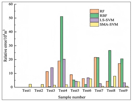 As illustrated in Figure 4, the discrepancies between the predicted results from the SMA-SVM model and the actual values were generally within 60,000 m3, and predicted values were significantly lower than the storage capacity of the tailings reservoir (3 to 15,500 m3). Except for Test1 and Test2, the errors of other algorithms were all within 600,000 m3. This indicates that machine learning can be used to predict the tailings discharge volume after tailings dam failure, but the SMA-SVM model exhibited higher prediction accuracy. The predicted results and mean absolute errors for each sample are plotted in Figure 6, while the relative errors from the SMA-SVM algorithm predictions are illustrated in Figure 7.