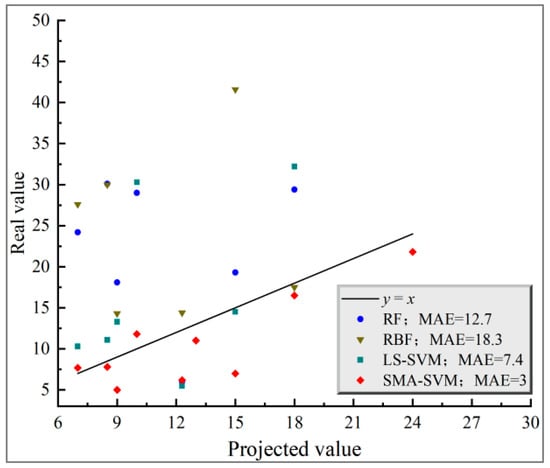 In summary, the prediction accuracy of the SMA-SVM algorithm is higher than other algorithms, such as the RF algorithm and RBF neural network, in predicting the amount of sand breakage in tailing ponds, so the method can be used for predicting the impact of dam breakage in tailing ponds, such as quickly estimating the impact range of dam breakage according to the amount of sand breakage and the flow characteristics of the discharged tailing slurry during the breakage, which can be used to provide a reference for the preparation of emergency response plans for this kind of accident, and for the implementation of protection design and other projects. However, the accuracy of machine learning is greatly affected by the number of samples, in order to avoid overfitting and underfitting phenomenon, in future research, we can continue to collect similar engineering cases, increase the number of samples and characteristic factors, so as to realize more accurate prediction.