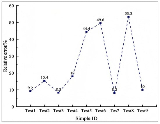 where RE represents the relative error; MAE denotes the mean absolute error that reflects the absolute deviation between multiple predicted results and actual values; ρ is the correlation coefficient, where values closer to 1 indicate predictions closer to actual values; n is the number of test samples (1 to 9); yi is the actual value of the i-th test sample; is the average value of the test samples; f(xi) is the predicted value of the i-th test sample; and is the average value of the predicted values.