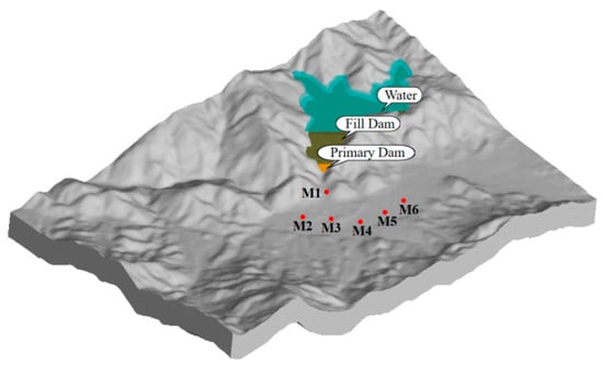 To validate the SMA-SVM algorithm, this study selects a case of dam failure from a valley-type tailings reservoir in Guangdong Province as the background [48]. The initial elevation of the tailings reservoir’s dam base is 709.5 m, with the final designed elevation of the stockpile dam top being 830 m. The total dam height is 120.5 m, and the initial dam height is 40.5 m. The storage capacity below the initial dam top elevation of the tailings reservoir is 1,028,000 m3, while the total capacity is 1.6 million m3. The tailings reservoir is classified as a Class II reservoir. The initial dam is a permeable rockfill dam, built at the entrance of a narrow and steep valley downstream. The elevation of the dam top is 755 m, with a dam height of 45.5 m and a dam top width of 7.5 m. The length of the dam top axis is 110 m. The upstream and downstream slopes of the dam are 1:1.6 and 1:2, respectively. In 2010, influenced by Typhoon Fanapi, the tailings reservoir experienced an overtopping dam failure, resulting in a tailings discharge volume of approximately 200,000 m3. Before the tailings discharge, the dam height of the tailings reservoir was 45.5 m, and the storage capacity was about 300,000 m3. A series of three-dimensional models were established based on the above information about the tailings reservoir. Different numerical simulation scenarios were designed, as shown in Table 4.