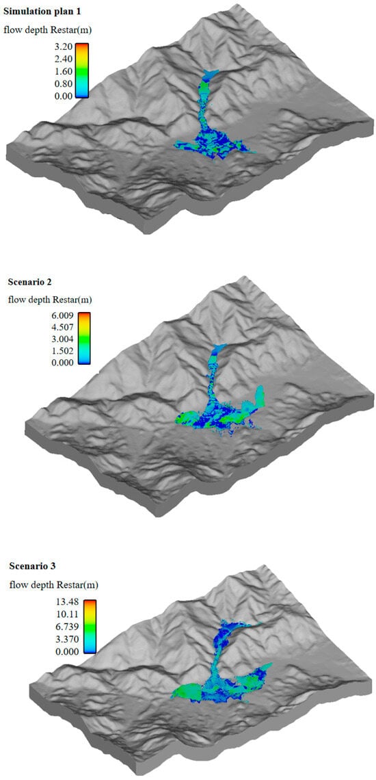 To truly reflect the flow characteristics during dam failure, this study employs a sediment module to simulate the movement of particles throughout the dam-failure process. In the calculations, the movement of tailings and their interaction with the water flow are represented by the suspended sediment equation. The ability of water flow to carry sediment is highly correlated with flow velocity. As water flow velocity increases, its capacity to carry sediment also increases. Once the water flow velocity reaches a threshold, the deposited tailings are entrained by the water flow, which facilitates them to transition from bed load to suspended load. These two states change alternately with the variations in water flow’s entrainment capability. According to the aforementioned theory, the simulation results for various scenarios are presented in Figure 9.