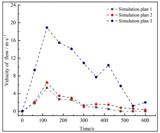 Flow velocity at monitoring point M5 for different dam-failure scenarios.