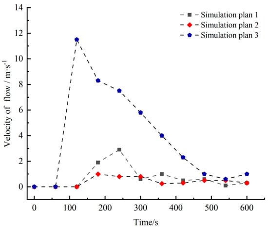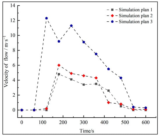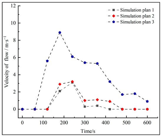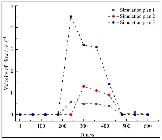 Flow velocity at monitoring point M3 for different dam-failure scenarios.