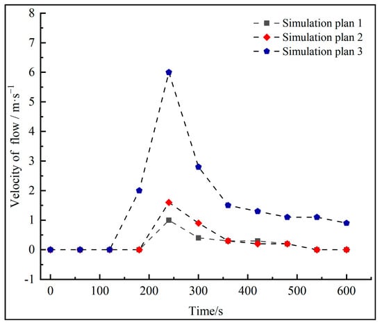 Analyses of the flow characteristics at different monitoring points over time revealed that the flow velocity at different monitoring points decreases with the increase in the flow path at the same moment. After the tailings dam failed, the discharged slurry reaches a peak velocity as it flowed through the monitoring point, and the time to reach this peak shortened as the tailings discharge volume and dam height increased. Throughout the dam-failure process, the influence range of the discharged slurry continuously expanded. The flow must overcome surface resistance contributing to a gradual decrease in velocity, and the velocity curve can be approximated as triangular. Once the kinetic energy carried by the slurry was exhausted, the flow ceased, and the influence range of the dam failure tended to stabilize.