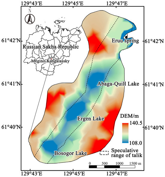 Eruu is situated in the central part of the Russian Republic of Sakha (Yakutia) (61.42° N, 129.46° E), with terrain sloping from southwest to northeast. In the vicinity of Eruu are three small lakes, Bosogor, Ergen, and Abaga-Quill Lake (Figure 1). The geographical location of the study area is far away from human habitation. The surface elevation gradually decreases from 163 m to 140 m [1,4]. The study area is underlain by permafrost with an active layer thickness ranging from 2 to 4 m [4]. The temperature of the rock beneath the permafrost reaches as high as −0.2 °C. Permafrost temperatures typically range from −0.7 °C to −0.02 °C. When the active layer is not fully frozen, lakes and atmospheric precipitation serve as the primary sources of recharge. On the northeast side, part of the groundwater drains as intrapermafrost water, while another portion emerges as spring water, forming icings. Largescale icings occur annually in the study area, primarily sourced from groundwater. The temperature in the study area ranged from −27.1°C to −50.2 °C between 2005 and 2022. Freezing begins when temperatures consistently drop below zero, typically occurring in late October in this region. The average icing accumulation period ranges from 189 to 213 days.