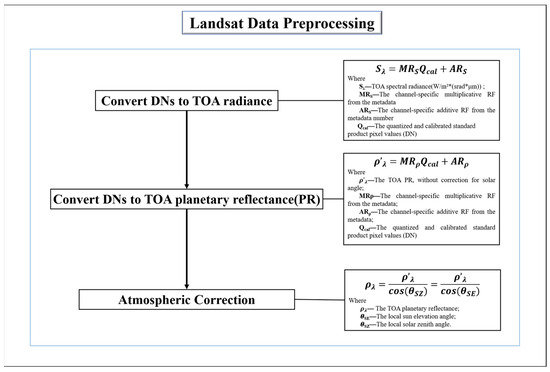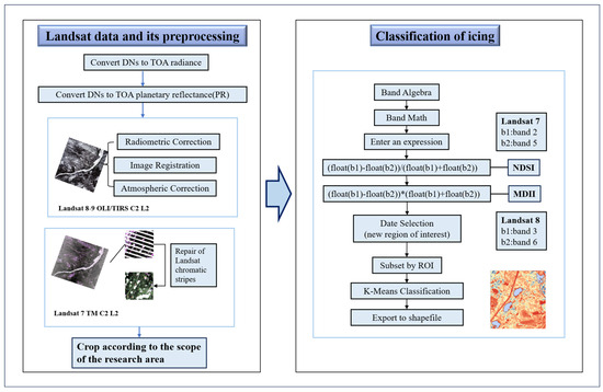 In this study, the icing area in Eruu was extracted and analyzed, focusing on the clear icing area in the study region from January to May, 2005 to 2024. Before calculating the water index, the remote sensing data must first undergo preprocessing. The DN values should be converted to TOA radiation and TOA reflectance, and dark targets should be removed. Following this, atmospheric correction should be performed. The purpose of atmospheric correction is to eliminate the influence of atmospheric and illumination factors on ground object reflectance and to obtain key physical model parameters, such as reflectance, emissivity, and surface temperature. This process also removes the effects of atmospheric components, including water vapor, oxygen, carbon dioxide, methane, and ozone, on ground reflectance. It also corrects for scattering effects caused by atmospheric molecules and aerosols. Radiometric correction addresses all radiation-related errors. Its goal is to remove interference and obtain accurate reflectance data. During atmospheric correction, data in non-BIL or BIP formats must be converted using the Convert Interleave tool, and the average elevation of the image should be calculated. Atmospheric correction is the process of eliminating radiation errors caused by atmospheric interference and retrieving the true surface emissivity of ground objects. The detailed preprocessing steps for the remote sensing data are shown in Figure 2.
