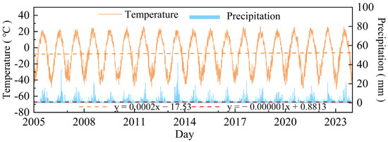 We used temperature and precipitation data from three weather stations near Eruu to interpolate and estimate Eruu’s temperature data from 2005 to 2024. The daily temperature and precipitation trends in Eruu from 2005 to 2024 are depicted in Figure 6. From 2005 to 2024, the overall precipitation in this region exhibited a slight downward trend. The maximum precipitation occurred on 3 August 2013, reaching 41.7 mm. Precipitation primarily occurs from April to October each year. The highest precipitation is observed in August and September. From 2005 to 2024, the overall temperature exhibited a slight upward trend. Both temperature and precipitation exhibited clear periodic fluctuations. The lowest temperature was −51.4 °C on 18 January 2023. The highest temperature was 27.1 °C on 5 July 2018.