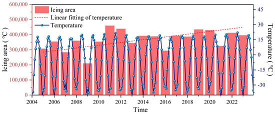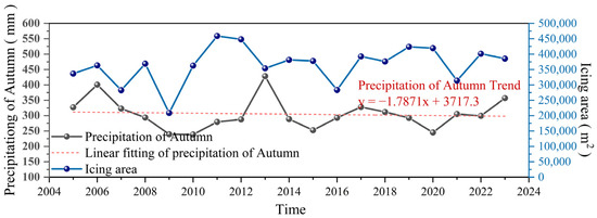 In studying the influence of precipitation on icing area development, we examined not only the effect of annual precipitation but also the impact of autumn rainfall and monthly precipitation. A weak correlation was found between autumn precipitation and icing area (r = 0.390). Figure 10 illustrates the interannual changes in autumn precipitation in Eruu from 2005 to 2023. Annual precipitation is positively correlated with the area of icings (r = 0.290). Precipitation in 2016 was lower than in other years, and the icing area in the study area began to decrease in that year.