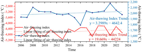 Interannual changes in Eruu air-thawing index and air-freezing index from 2006 to 2023.