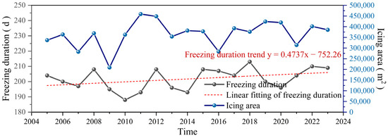 Temperature response to freezing is reflected not only by the increase in temperature but also by the variation in freezing duration from year to year. The number of freezing days each year is calculated from the first day in autumn when the temperature drops below zero to the day the following year when it rises above zero. Figure 9 illustrates the interannual variation in Eruu’s freezing duration from 2004 to 2023. Freezing duration exhibited an increasing trend with a rate of change of 0.47 d/year, similar to the trend observed in icing area. Freezing duration was positively correlated with icing area (r = 0.471). The maximum freezing duration occurred in 2018, lasting 213 days. The minimum duration was 188 days in 2010. In years with greater icing area development, the freezing duration of the study area was longer. The icing area reached its maximum in 2016. The freezing duration in 2015 and 2016 was also longer. The trends in icing area and freezing duration in the study area from 2004 to 2010 and from 2019 to 2024 are largely consistent. In summary, we conclude that freezing duration affects the development of icings in the current year, and longer freezing periods over two consecutive years have a greater cumulative impact.