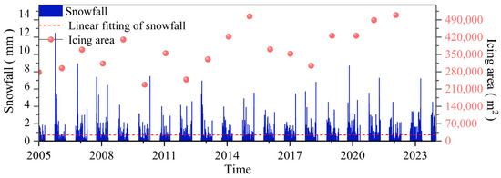 Eruu’s snowfall distribution from 2005 to 2023 is shown in Figure 11. The annual total snowfall peaked at 114.7 mm in 2023 and reached a minimum of 57.8 mm in 2011. The icing area expanded significantly in years with lower snowfall, with 2011 showing an icing area of 227,700 m2. Daily snowfall in Eruu ranges from 0 to 11.9 mm. Annual total snowfall significantly influenced the icing area, showing a negative correlation (r = −0.544). This is attributed to the insulating effect of snow. As the snowpack increases, its insulating properties slow the development of icings at contact sites. Snow significantly influences icing development through its insulating properties. In early winter, thin snow layers mixed with overflow groundwater accelerate icing formation. As snow thickness increases, its insulation effect slows the development of underlying icings. Icings function as a temporary water storage, delaying drainage during the melt season. Their impact on the plateau basin’s water balance is short term, with the icings persisting long after the snow melts.