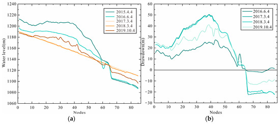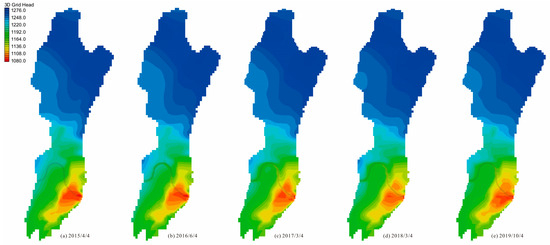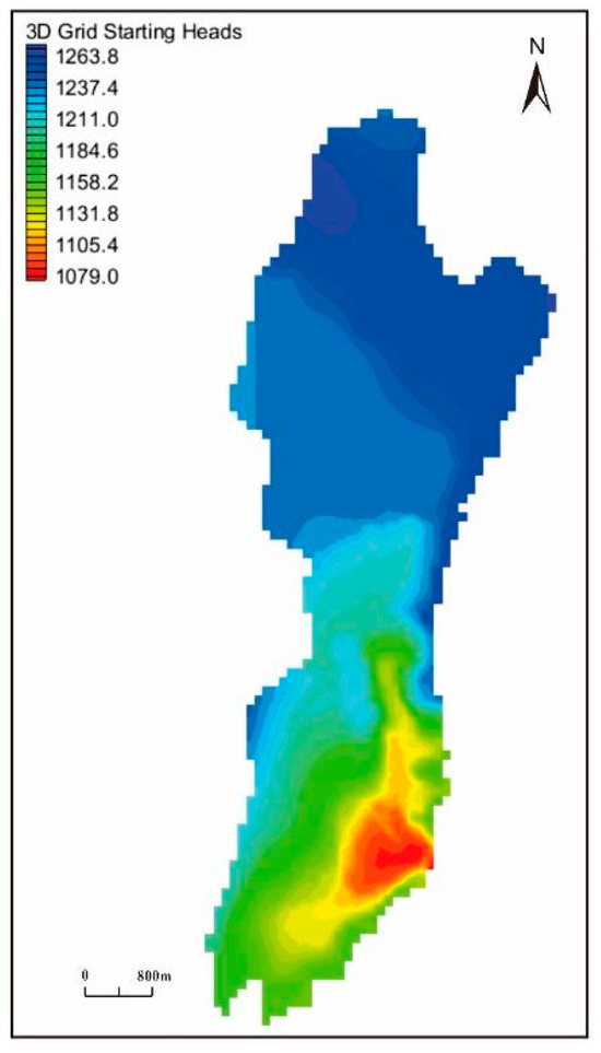- The natural water levels and preproject groundwater flow fields were simulated based on the regional hydrogeological characteristics and historical water level data. Under natural conditions, the regional groundwater flow field depends mainly on topography, geological lithology, structural characteristics, and precipitation. The groundwater levels increase in the north–west direction and decrease in the south–east direction.