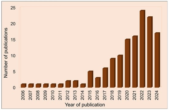 Number of REVIEWS published each year between 2006 and 2024 about cytostatic drugs degradation by advanced oxidation processes according to a search in the SCOPUS database with the following keywords: “advanced oxidation process” AND “cytostatic drugs” AND PUBYEAR > 2003 AND PUBYEAR < 2025 AND PUBYEAR > 2005 AND PUBYEAR < 2025 AND (LIMIT-TO (DOCTYPE, “re”)).
