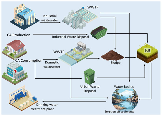 It is important to note that certain CA compounds exhibit distinctive behavior due to their relatively low solubility in water. This property enables these compounds to adsorb more readily to solid matrices, including sludge and sediments. Such sorption interactions inhibit their biodegradation, thereby rendering traditional wastewater treatment less effective in their complete removal. Instead of undergoing degradation, these compounds are often removed alongside the sludge from WWTP and transported away from the aqueous phase but not chemically transformed or neutralized [83,84].