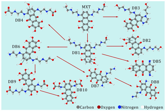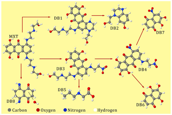 Wu et al. [102] investigated the DB generated during the Fenton-like oxidation of MXT using a hybrid rGO/FeNPs system. HPLC-MS identified several compounds formed through complex chemical transformations, including cyclization, oxidation of side-chain amino groups, side chain deletion, and the destruction of the anthraquinone core. The proposed degradation pathway illustrated in Figure 3 highlights the complex degradation mechanism facilitated by rGO/FeNPs, which acts as both adsorbent and catalyst where MXT is concentrated on the catalyst surface for targeted oxidation by HO•. This mechanism is particularly relevant for understanding the behavior of CA in water matrices, the potential detoxification of the by-products and highlights the environmental relevance of this AOP.