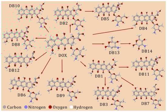 CA are compounds with complex chemical structures, high molecular mass, and varying excretion rates (Table 3). Specialized literature shows that bleomycin (BLEO) has an excretion rate of 60% to 70%, being classified as very toxic [49], followed by doxorubicin (DOX) with a maximum of 45% detected in urine without any change after passing through the body [50]. In addition, the amount excreted through feces represents half the compound administered [51]. Daunorubicin (DAU) has a similar behavior to DOX with the same maximum excretion in feces (50%) [52]. Within the L01DB subgroup, other anthracyclines present similar excretion percentages, in the range of 2% to 11% for idarubicin (IDAU), mitoxantrone (MXT), and pirarubicin (PRB) [53,54,55]. The excretion range with the lowest maximum value was exhibited by ixabepilone (IBP), with only 5–6% as reported by Benet et al. [56].