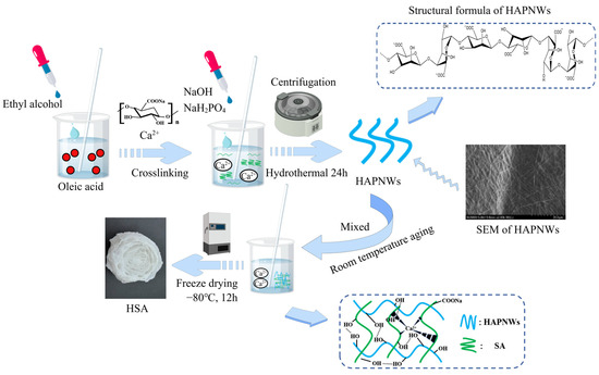 HAPNW slurry was synthesized using an improved hot solvent method [15]. The specific synthesis scheme was as follows: NaOH (0.9 g), CaCl2 (0.33 g), and NaH2PO4·2H2O (0.435 g) were dissolved together in 15 mL of deionized water before the hydrothermal treatment; oleic acid (10 mL) and anhydrous ethanol (15 mL) were evenly mixed using the hydrothermal method and then added into the above mixture of deionized water and medication (total 40 mL). HAPNW slurry was obtained by centrifugation of NaOH, anhydrous ethanol, and water for 24 h after hydrothermal reaction at 180 °C, 2 Mpa. The prepared HAPNWs slurry (2 g) was fully dispersed in deionized water (40 mL). SA (0.5 g) was added to the dispersion solution (40 mL) until the mixture was thick and uniform, and a CaCl2 solution (0.05 mol/L, 40 mL) was slowly added to the mixture along the wall. After aging at room temperature for 3 h, a solid hydrogel was obtained. We speculate that it is absorbed in the form of Pb-O ions and transformed into metallic Pb. The hydrogel was pre-frozen at −80 °C for 12 h and freeze-dried to obtain the composite biomass aerogel (HSA). Pure SA aerogel prepared without HAPNWs was recorded as SAA. The schematic diagram of HSA preparation is shown in Figure 1.