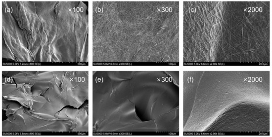 SEM images of HSA with and without HAPNW. (a) HSA with HAPNWs (100× magnification); (b) HSA with HAPNWs (300× magnification); (c) HSA with HAPNWs (2000× magnification); (d) HSA without HAPNWs (100× magnification); (e) HSA without HAPNWs (300× magnification); (f) HSA without HAPNWs (2000× magnification).